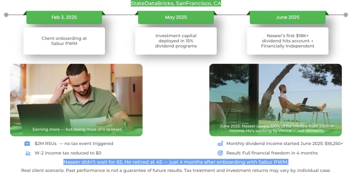 Naseer became financially independent by June 2025, only 4 months after joining Sabur PWM — while still in his 40s —by using the RSU tax-neutral pledge strategy and dividend income stream.