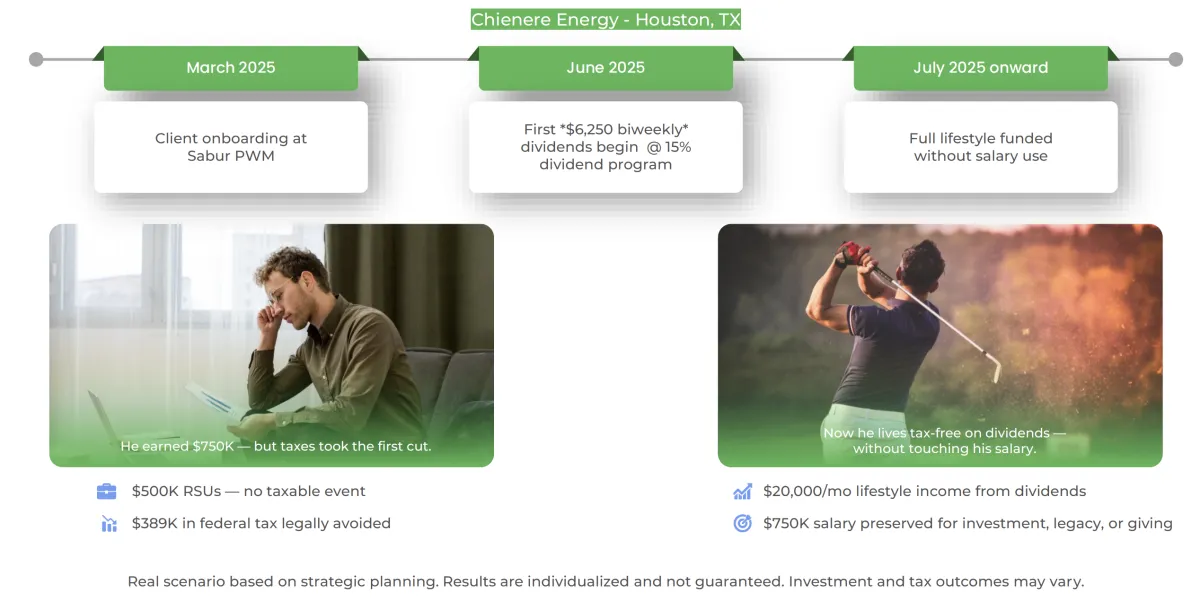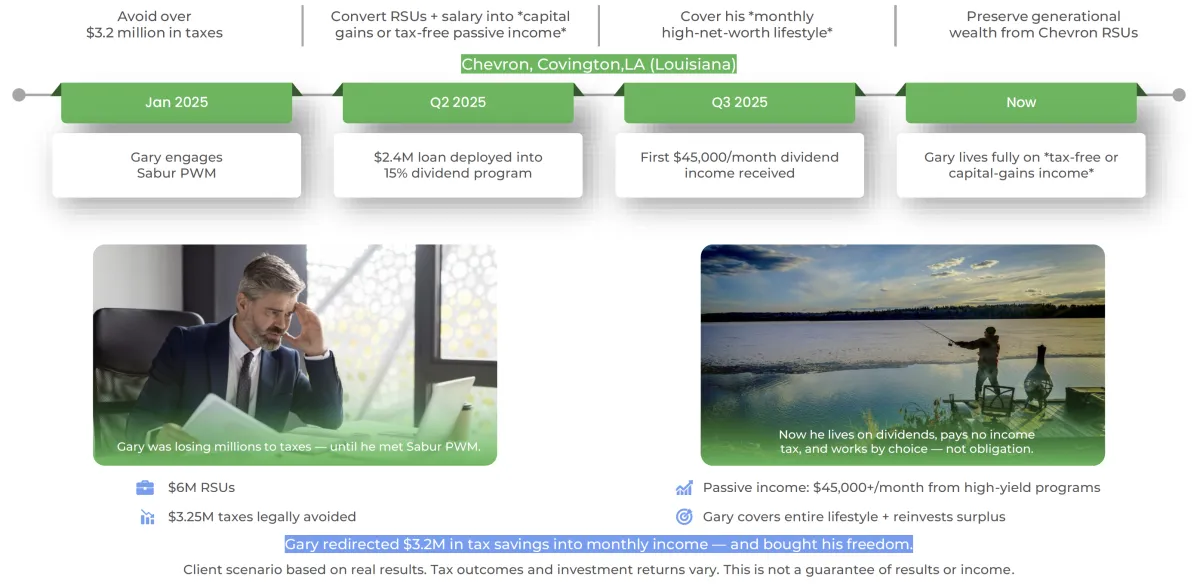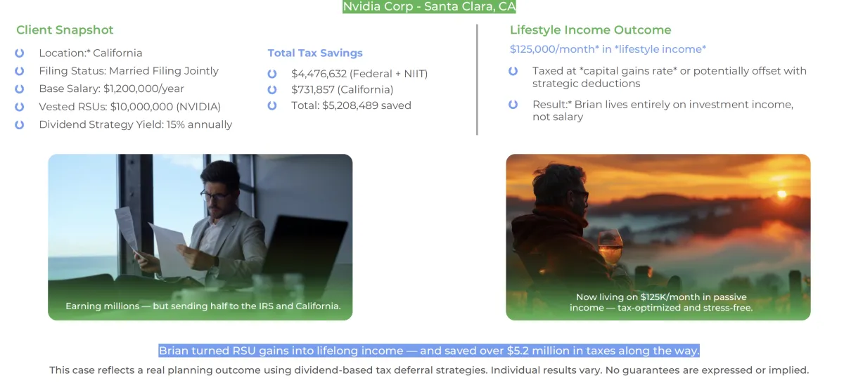 Brian D. — a high-earning California executive — used a dividend-focused investment strategy to convert his RSU portfolio into reliable, tax-advantaged income, while eliminating over $5.2 million in combined federal and California income taxes.